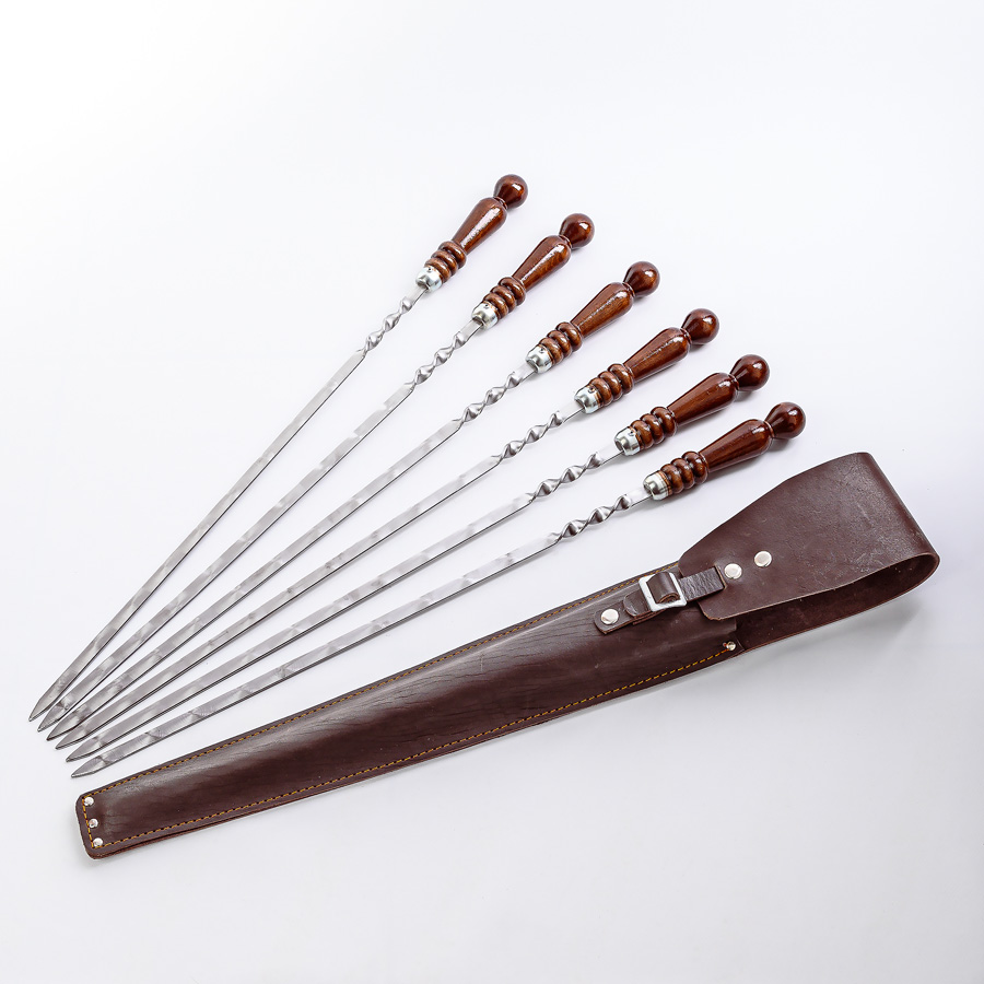 Набор из 6-ти нержавеющих шампуров 670*12*3 мм с деревянной ручкой в кожаном колчане изготовлен из высококачественной нержавеющей стали толщиной 3 мм. Ширина лезвия - 12 мм. Длина рабочей поверхности - 500 мм. Общая длина каждого шампура - 670 м..