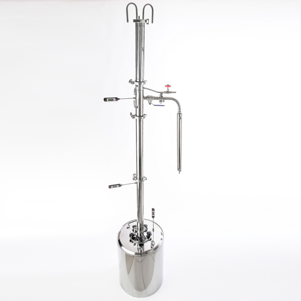 A 2-inch distillation column with a dimrot of 40/110/t should be bought by hospitable owners who regularly host guests and relatives at festive feasts. A distillation cube with a volume of 40 l provides for one distillation a worthy volume of alcohol with a strength of 96.6%, purified from any impurities. Most importantly, you don’t need to be a home brewing guru, to be a specialist in heat engineering and to understand all the subtleties of physical processes inside a column. It is enough to adjust the heating rate of the distillation cube and the rate of water supply to the dimrot.