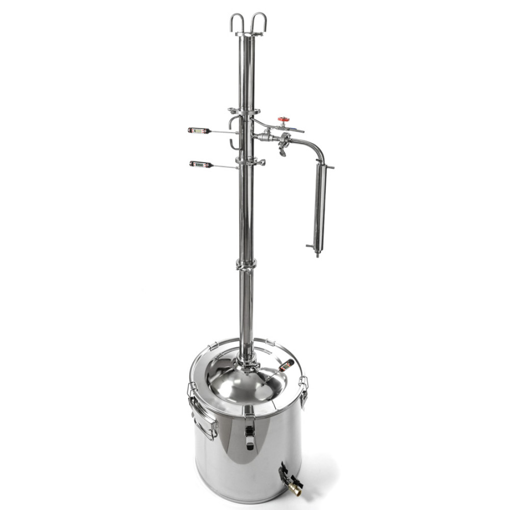 Collect a distillation column with dimrot in the configuration to obtain the maximum alcohol purification (two half-shells 0.5 m with a full packing of both half-cups with a nozzle) or to obtain noble distillates (two half-cups 0.5 m with one half-cup packing of 50 cm). In this process, it makes sense to control the temperature in the cube and in the drawer (1/3 of the selection unit). Pour in crude alcohol and start heating. Set the heating power to maximum. The strength of the SS in the cube is recommended about 40%. A smaller fortress will necessitate the heating of more liquid and, consequently, the waste of more electricity and water for refrigerators. Moreover, the smaller strength of the SS does not lead to any advantages. The large SS fortress makes the distillation column difficult to work because at a fortress of more than 40%, azeotropes are formed, the separation of which is difficult to cope with in the normal rectification mode. Therefore, we degrade the quality of the final product. The search for the optimal operating mode of the column is as follows (it is performed once for each use case of the column - alcohol and noble distillates):